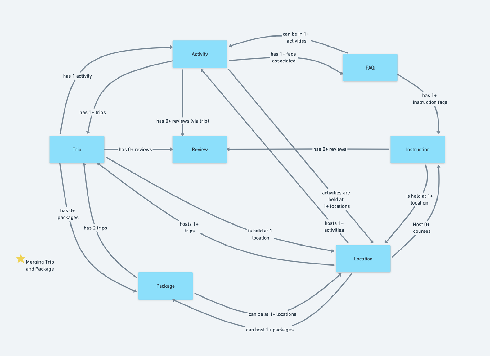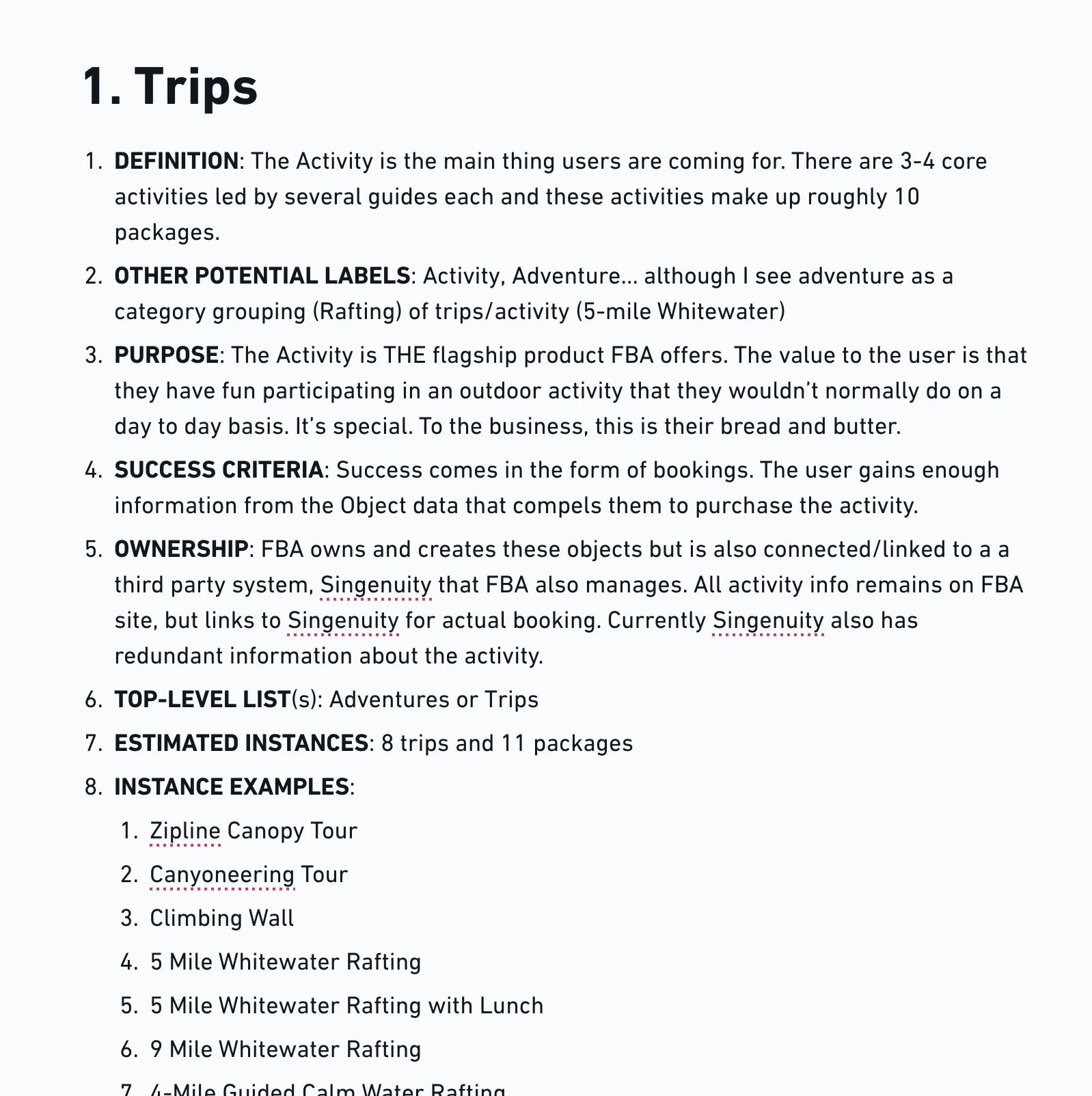 Research was performed using the current website content, user reviews, interviews, and analysis of industry peers. Object identification through noun foraging, and modeling of the relationships between these objects revealed that Trips, Activities, FAQs, Reviews and Locations are mainly what users are looking for (and once the service is launched, Courses). From there we were able to determine the attributes that make up the site's structured content, and finally the main calls-to-action throughout the website.